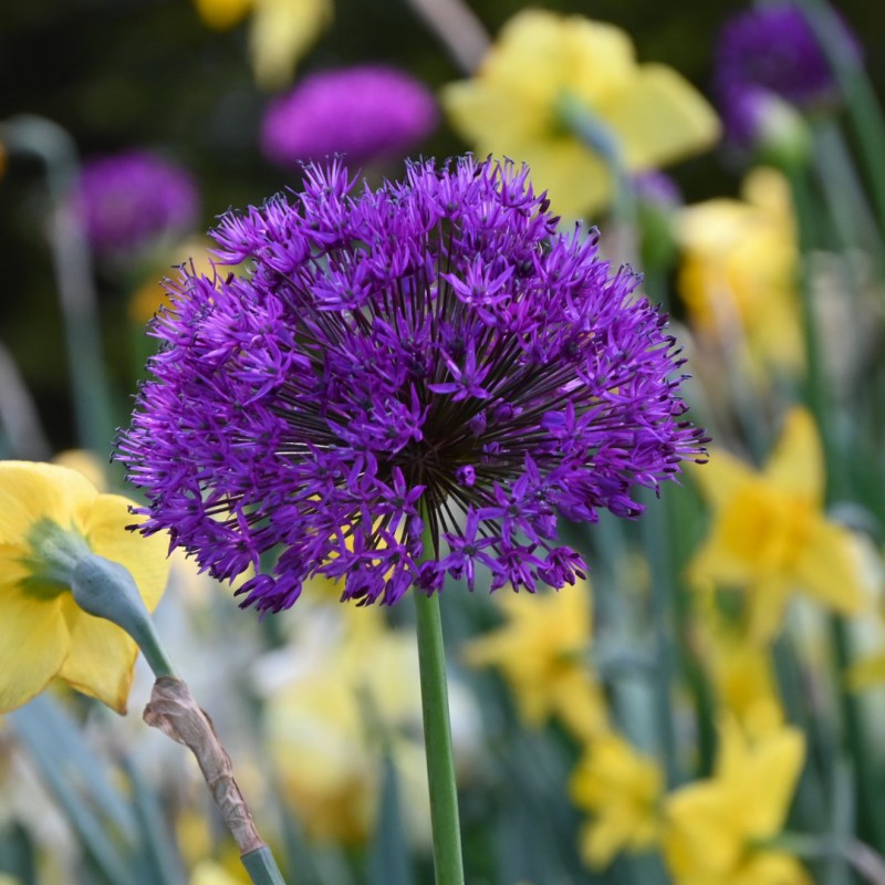 (Allium aflatunense 'Purple Sensation'). Well-known, grateful ornamental onion with round, purple flowers. For an Allium, it flowers quite early, as early as the end of April. Great for naturalising, also in places with less sun. Height 80 cm.