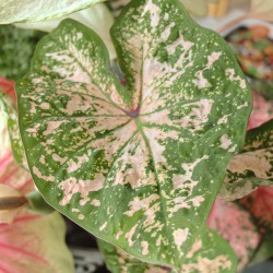 Angel wings, Fancy Leaf. A decorative plant with arrow-shaped leaves, soft green with pink spotted, originating from the tropical forests of e.g. Brazil. To be used as a houseplant or pot plant for a place with high humidity. Immediately after potting the tuber in a warm spot, keep it around 20 degrees Celsius during growth, out of the sun (indirect light). Do not keep the potting soil too moist, but never let it dry out and give some nutrition once a month. In winter, the plant goes dormant and the tuber can be overwintered in the pot, never below 12 degrees.