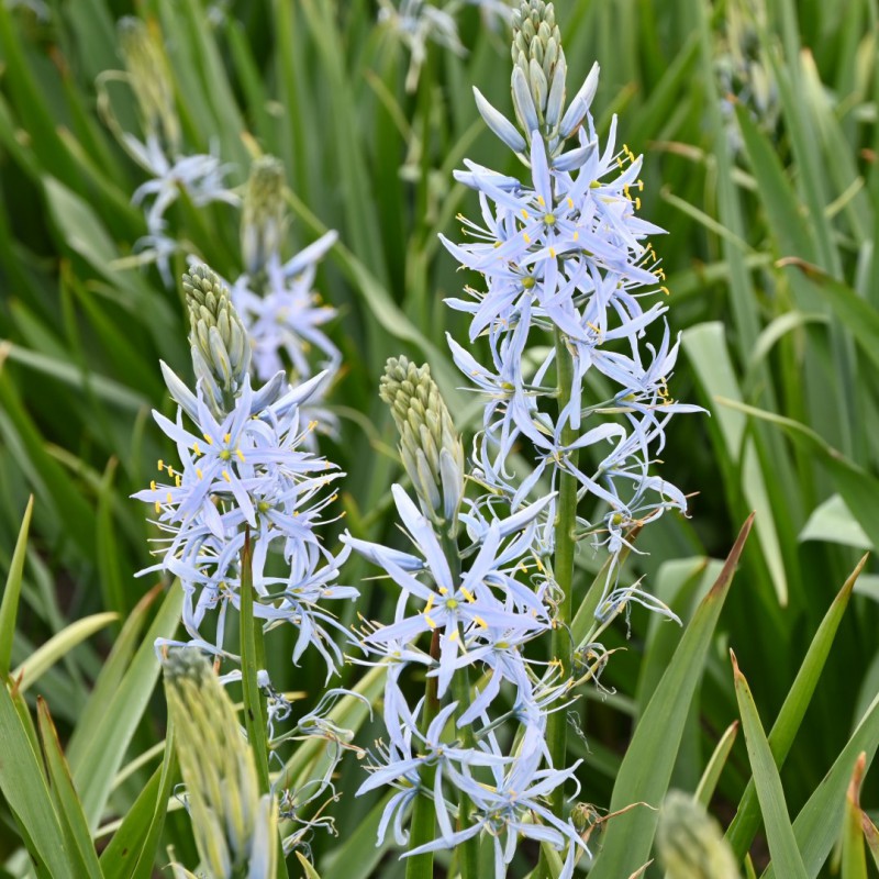 A pale blue Camassia, height 70 cm. Flowering time: May-June. Suitable for borders and for growing under trees and shrubs.