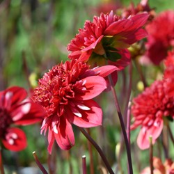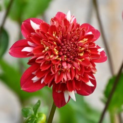Anemone-flowered dahlia with vivid red flowers, above the outer petals are slender, white petals, giving a frivolous effect. The full heart is red. Flower size 11 cm.