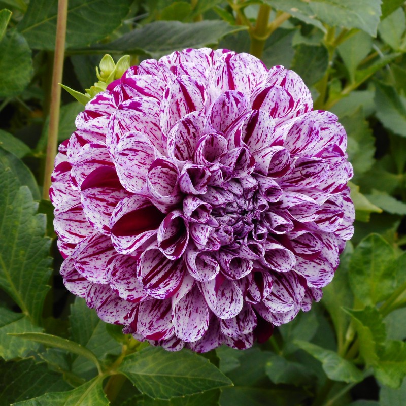 Ball-dahlia, white with lilac, perfect cut flower. Flower size 9 cm.