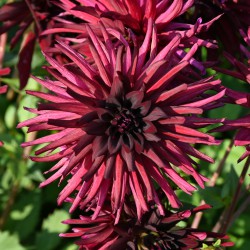 Semi-Cactus-Dahlie mit auffälligen, schwarzroten Blüten, 15 cm im Schnitt.