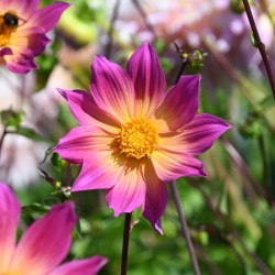 Beautiful single flowered Dahlia, fuchsia pink and bright-yellow in the centre. Flowersize 8 cm. ORGANICALLY GROWN.