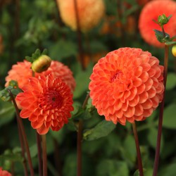 Pompon dahlia, beautifully shaped, round, orange flowers. Flower size 6 cm.