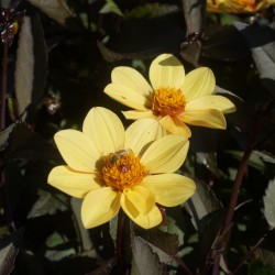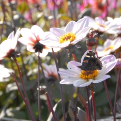 Single-flowered Dahlia, white flowers with soft pink tops. Dark foliage. Flower size: 5 cm.