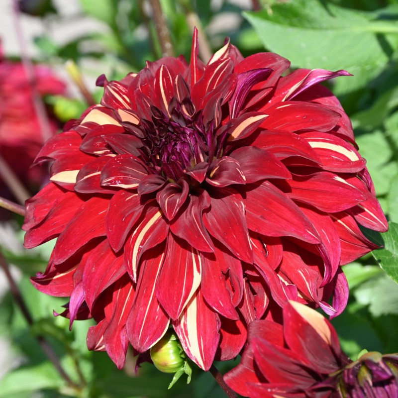 Decorative dahlia. Purple-red, yellow flamed. Flower size 20 cm.