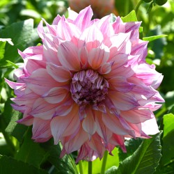 The soft pink version of Dahlia 'Café au Lait' with bright pink stripes. Large flowered decorative dahlia height 80 cm. Flower size 25 cm.