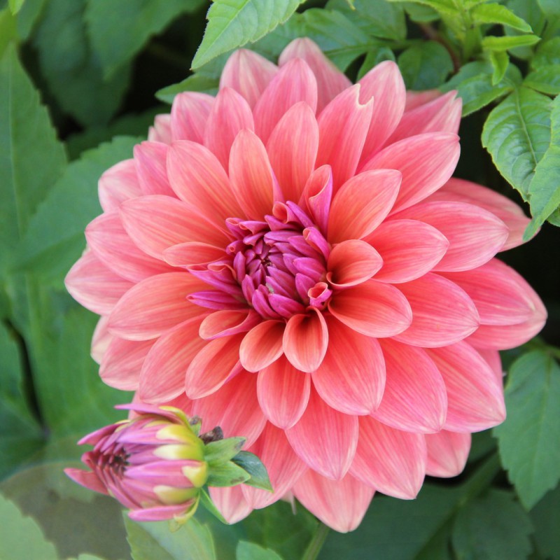 Decorative dahlia, coral pink flowers with a purple center, flower size 15 cm.