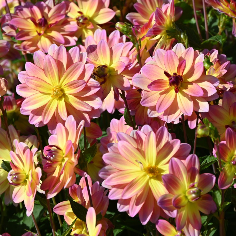 Very richly flowering, small-flowered dahlia. Semi-double, yellow flowers that turn pink at the top of the petals. Flower size 8 cm.