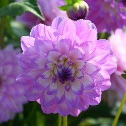 Decorative dahlia, with beautifully arranged white petals edged with lilac blue. Flower size: 110 cm.