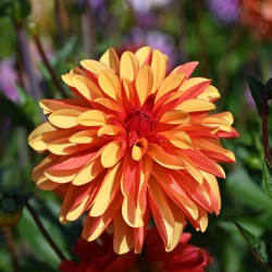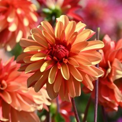 Decorative Dahlia with orange flowers, the back of the petals being dark orange. Flower size: 11 cm. ORGANICALLY GROWN.