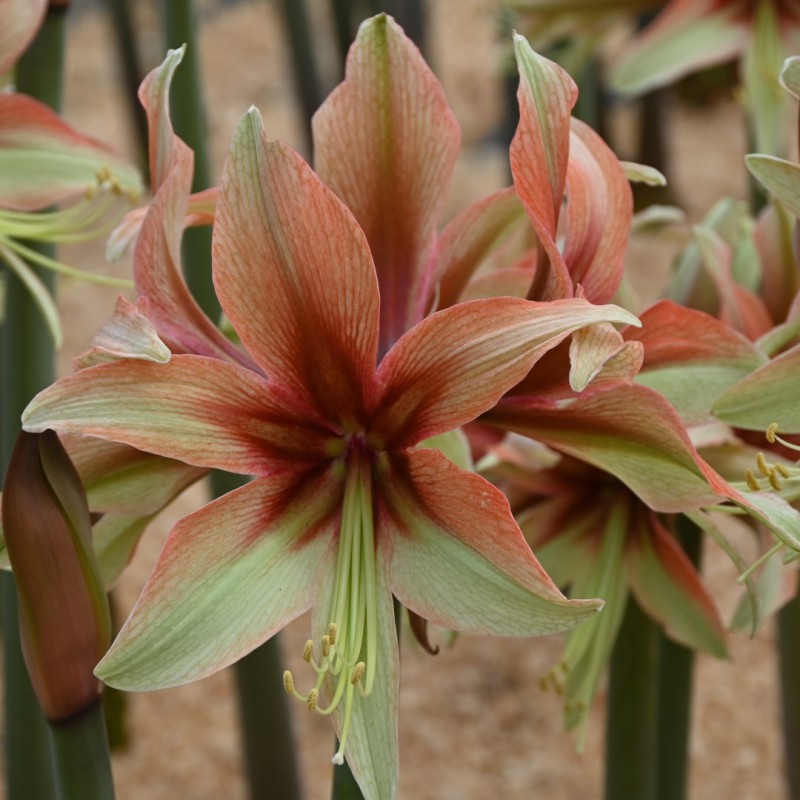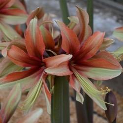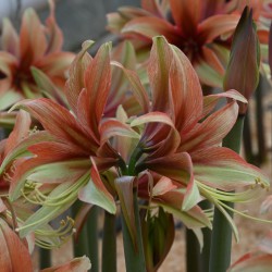 Lime green with terra. Butterfly Group. Plant the bulb halfway into the soil. Use a large pot with a drainage hole. For development of the stem, warmth is especially important, therefore it is best to keep it at room temperature. Needs little water until the stem emerges. Once the bud and the leaf appears, the amaryllis needs to be watered daily. In winter, it takes about 6 to 10 weeks after potting up before it comes into bloom.