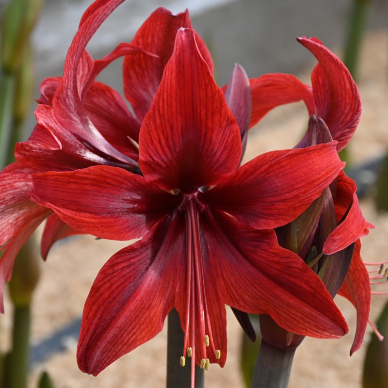 Deep Red. Butterfly Group. Plant the bulb halfway into the soil. Use a large pot with a drainage hole. For development of the stem, warmth is especially important, therefore it is best to keep it at room temperature. Needs little water until the stem emerges. Once the bud and the leaf appears, the amaryllis needs to be watered daily. In winter, it takes about 6 to 10 weeks after potting up before it comes into bloom.