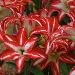 Bright red with a white center, unusual shaped flowers. Double Galaxy Group. Plant the bulb halfway into the soil. Use a large pot with a drainage hole. For development of the stem, warmth is especially important, therefore it is best to keep it at room temperature. Needs little water until the stem emerges. Once the bud and the leaf appears, the amaryllis needs to be watered daily. In winter, it takes about 6 to 10 weeks after potting up before it comes into bloom.