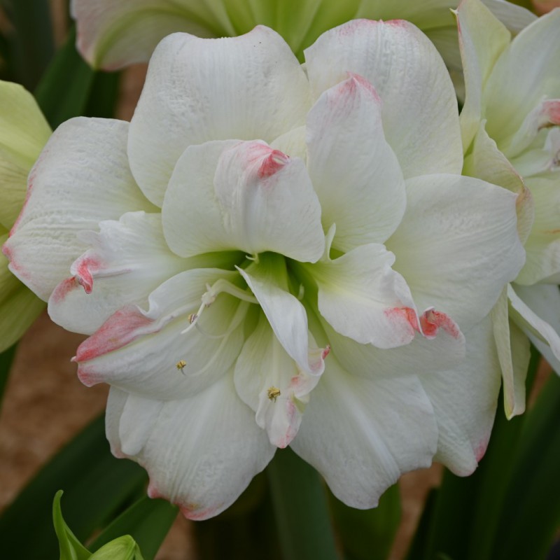 Amaryllis, white with pink at the tips of the petals. Double Galaxy Group.
