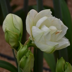 Very large, white double-flowers. Double Galaxy Group. Plant the bulb halfway into the soil. Use a large pot with a drainage hole. For development of the stem, warmth is especially important, therefore it is best to keep it at room temperature. Needs little water until the stem emerges. Once the bud and the leaf appears, the amaryllis needs to be watered daily. In winter, it takes about 6 to 10 weeks after potting up before it comes into bloom.