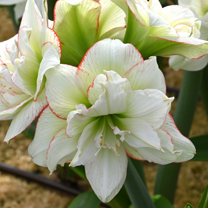Double white flowers, delicate red edge. Double Galaxy Group.