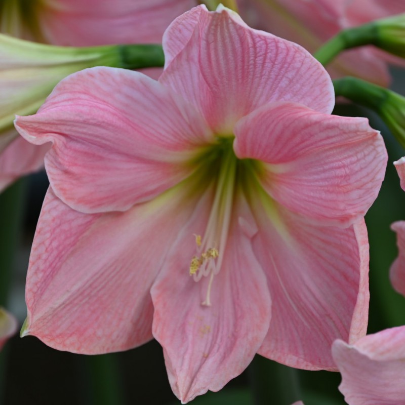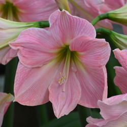 Pale pink. Galaxy Group. Plant the bulb halfway into the soil. Use a large pot with a drainage hole. For development of the stem, warmth is especially important, therefore it is best to keep it at room temperature. Needs little water until the stem emerges. Once the bud and the leaf appears, the amaryllis needs to be watered daily. In winter, it takes about 6 to 10 weeks after potting up before it comes into bloom.