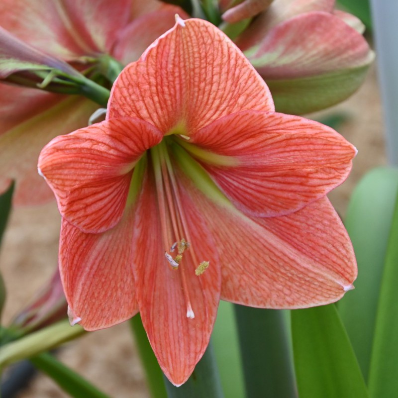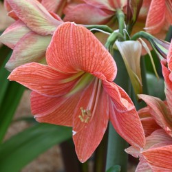 Orange-brown flowers, beautiful color. Galaxy Group. Plant the bulb halfway into the soil. Use a large pot with a drainage hole. For development of the stem, warmth is especially important, therefore it is best to keep it at room temperature. Needs little water until the stem emerges. Once the bud and the leaf appears, the amaryllis needs to be watered daily. In winter, it takes about 6 to 10 weeks after potting up before it comes into bloom.