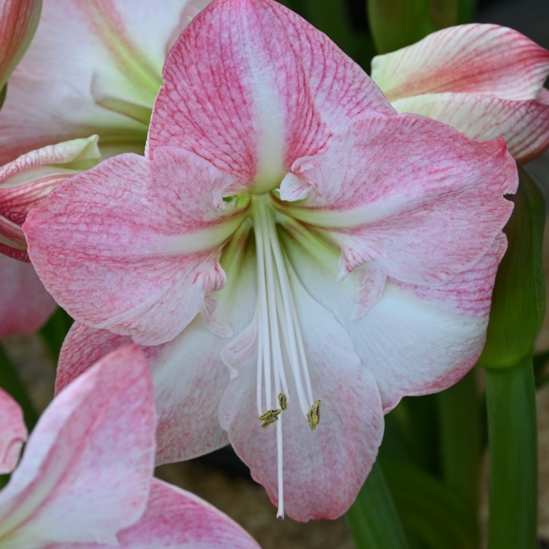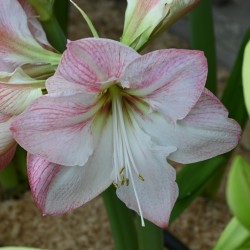 Pink with white, flowersize, 22 cm. Galaxy Group. Plant the bulb halfway into the soil. Use a large pot with a drainage hole. For development of the stem, warmth is especially important, therefore it is best to keep it at room temperature. Needs little water until the stem emerges. Once the bud and the leaf appears, the amaryllis needs to be watered daily. In winter, it takes about 6 to 10 weeks after potting up before it comes into bloom.