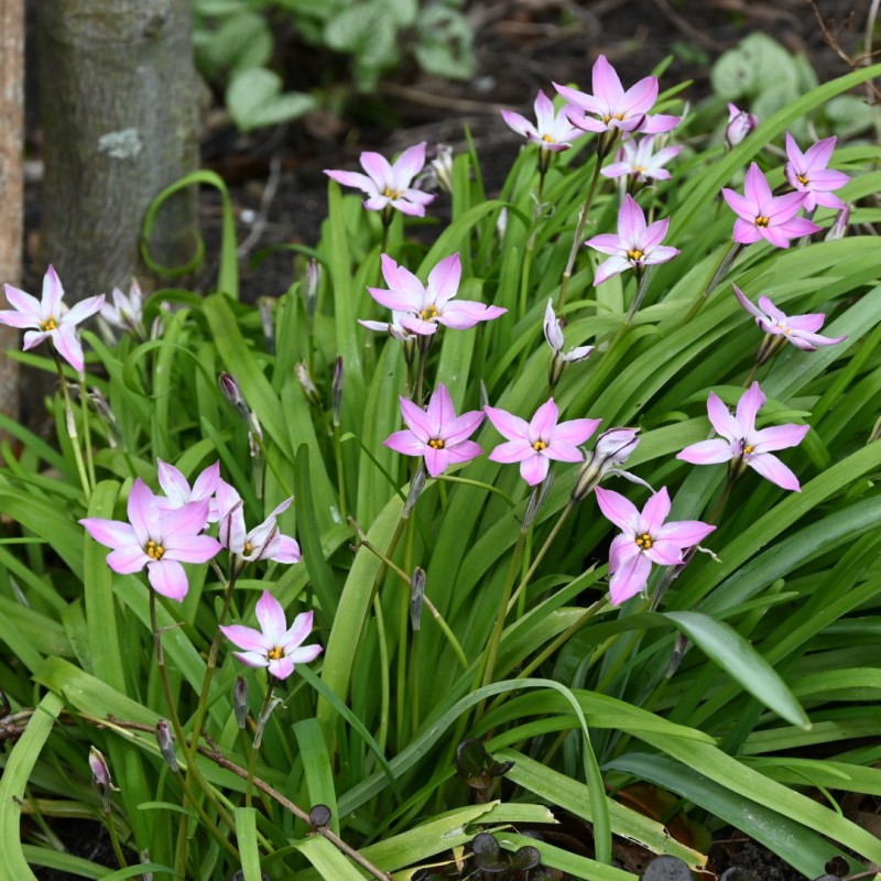 Triteleia,Starflower, spring starflower, star-shaped pink flowers among grassy foliage. Ideal for naturalising in sunny, dry sites. The leaves give off a slight onion scent, the flowers are softly scented.