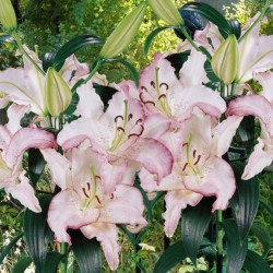 Large, fragrant, white flowers with pink edges along the petals. For the most part outward or slightly downwards facing flowers.