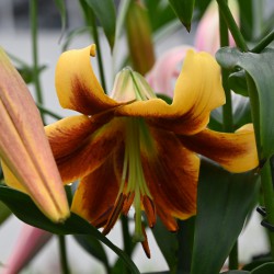 Tree lilie, yellow with red. A cross between Oriental lilies and Trumpet lilies. This has produced quite high, but firm lilies, usually with slightly downwards, large, fragrant flowers. Despite the height, the lilies remain upright, so they are perfectly suited for the garden.