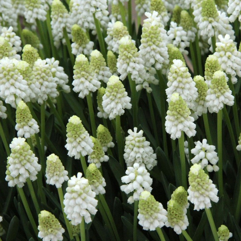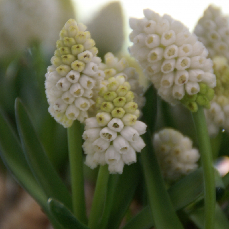 Grape hyacinth. Flowering time: April-May. Height 10-20 cm. White, early flowering.