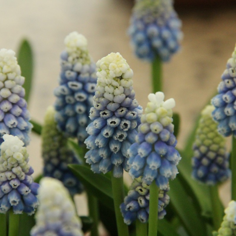 Grape hyacinth with bicoloured flowers. Light blue flowers with a white top.