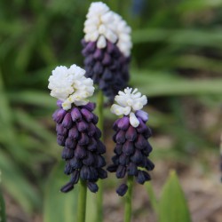 Grape hyacinth with broad leveas and a special flower color: the underside is violet-blue, the top is white.
