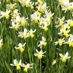 An early flowering, not too tall cyclamineus with white petals and a yellow trumpet. Fine for naturalising.