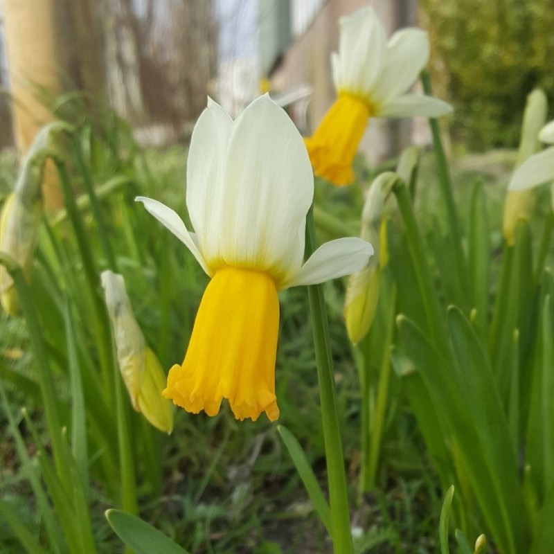 White with a salmon orange trumpet. Height 25 cm.