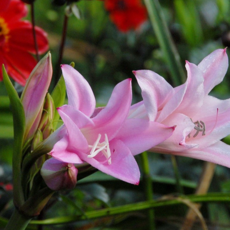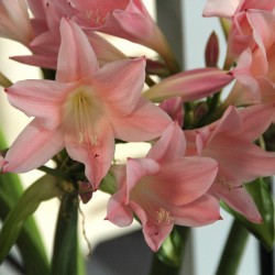 A cross between Amaryllis belladonna and Crinum moorei. An autumn-flowering bulbous plant with sturdy stems bearing trumpet-shaped pink flowers. The foliage remains green in winter. Amarcrinum can tolerate a few degrees of frost (plant deeply), but is only moderately winter hardy if well covered. Can also be kept as a container plant.