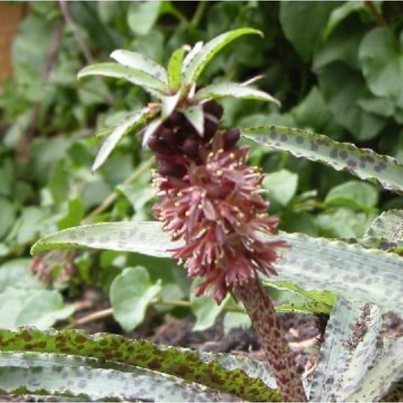 Pineapple flower. beautiful dark purple Eucomis. The stem is purple red and the leafs are nicely dark variegated, dwarf growing variety, very good for potting.