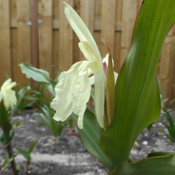Ginger Orchid, flowering from Juny, prefers a sunny or half shaded place in the border or rock garden, hardiness zone 6-9. Cream colored with purple stripes.