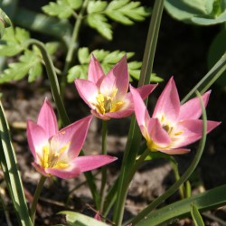 A fragrant wild tulip, native to Iran and Syria. The pink, star-shaped flowers appear up to three per stem above the grey-green wavy leaves.