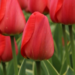 Sturdy Darwin hybrid with large, scarlet flowers on firm, up to 60 cm tall stems. A subtle soft yellow margin along the leaf.