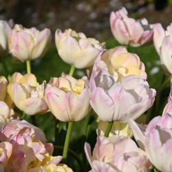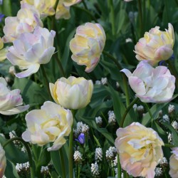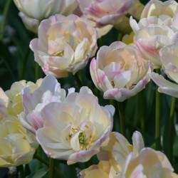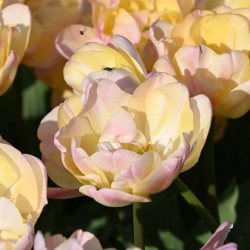 Double late tulip, soft beige yellow with light pink on the outside of the flower.