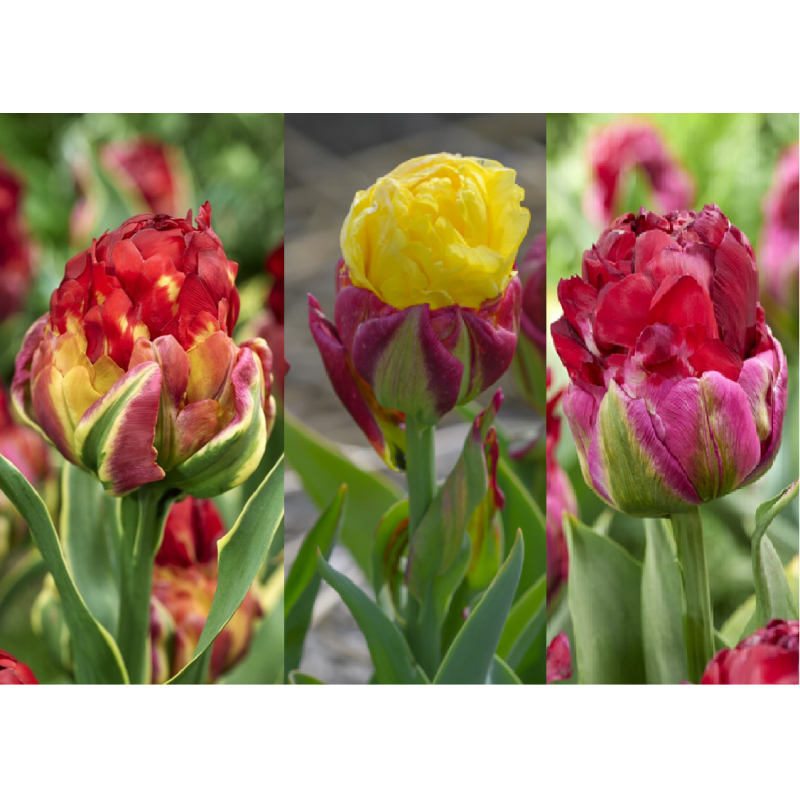 Very double tulips with a distinctive flower shape, resembling an ice cream cone.