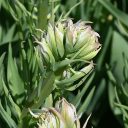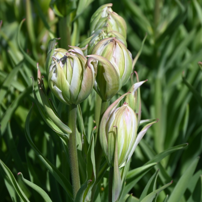 An unusual flower shape for a Fosteriana tulip: the slightly variable white-green flowers are double and composed at the top of many narrow petals. The upper stem petals are distorted petals, a curious feature.