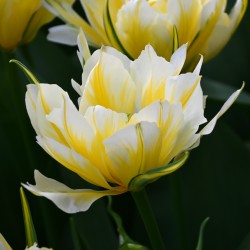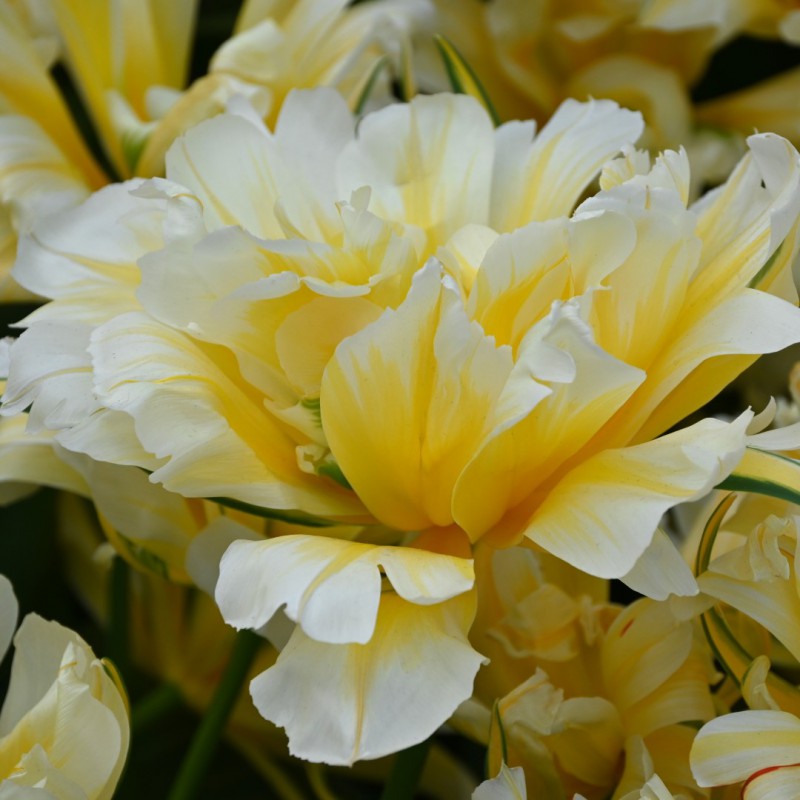 A double-flowered Fosteriana tulip, the outer soft yellow petals are irregular, green flamed.