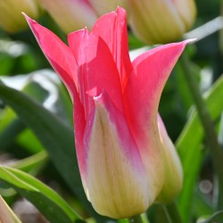 Very large lily-flowered tulip, pinkish red with soft yellow flower.