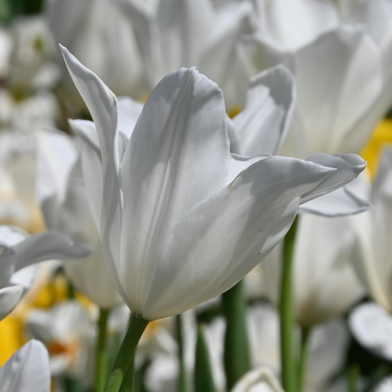 Elegant tulip with pointed petals, late flowering (May), white. Height 40-60 cm.