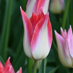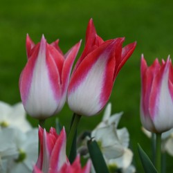 A Triumph tulip with the elegant flower shape of a lily-flowered tulip. Strawberry red with ivory white.