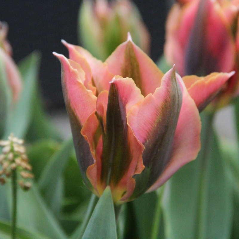 Viridiflora tulip, salmon-pink flowers with purple and green. Late-flowering.
