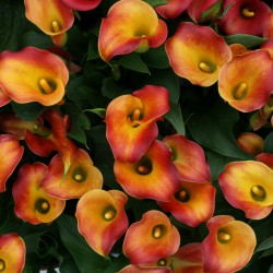 Calla, Arum-lily, orange-yellow flamed. An increasingly popular pot plant, both on the terrace and in the windowsill. For the longest possible bloom throughout the summer, regular fertilising in the flowering season is important.